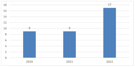 The initial focus of our study was to analyze the recent trends in research involving monitoring devices over the past three years. Specifically, we targeted the years 2020, 2021, and 2022 to investigate the potential impact of the COVID-19 pandemic-related quarantine measures and to understand the evolving adoption of wearable devices. There were nine papers published in 2020, nine papers in 2021 and seventeen papers in 2022, showing almost the same number in the first two years and a significant rise in the last year (Figure 2). The consistent number of papers in the initial two years followed by a substantial surge in the final year indicates a significant growth in interest in wearable device research.
