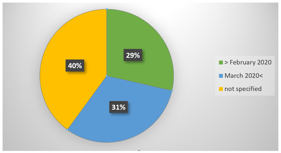 After quality assessment, we found ten studies conducted prior to the COVID-19 pandemic, with five being undertaken in 2019 and another five in preceding years. Meanwhile, 11 studies were carried out post-March 2020, coinciding with the World Health Organization’s declaration of the pandemic. Intriguingly, 14 studies lacked specific year indications for their research conduct. Among these unspecified studies, 11 were eventually published between 2021 and 2022, while 3 were published in 2020 (Figure 3).