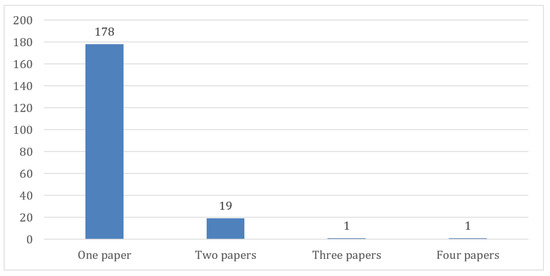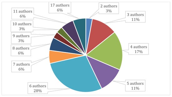 Another valuable piece of information was the number of authors per paper. None of the selected articles were the sole work of an independent author; rather, a collective approach prevailed. Notably, papers authored by six individuals constituted the largest proportion, accounting for 28% of the sample (ten papers). This was closely followed by papers with four authors (17%, six papers), three authors (11%, four papers), and five authors (11%, four papers). Additionally, papers authored by seven, eight, eleven, and seventeen individuals each represented 6% of the sample, with two papers per category. In contrast, papers authored by two, nine, and ten individuals constituted a smaller percentage of 3% each, with one paper for each category (Figure 5).