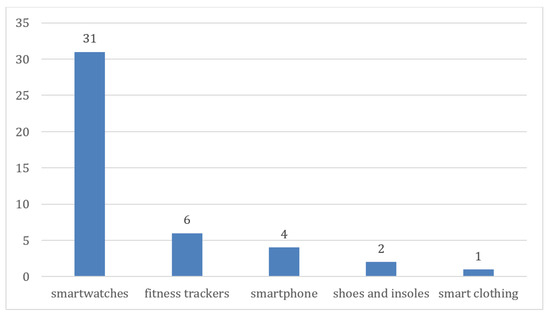 We directed our inquiry towards discerning the types of monitoring devices preferred by researchers in their investigations. Categorizing these devices into five distinct groups—shoes and insoles, sport watches, smartphones, fitness trackers, and smart clothing systems—we identified a total of 44 devices employed across various studies (as illustrated in Figure 6). Smartphones used were both Android (1) and iOS (2), while fitness trackers included Fitbit (6), Mymo (1), and Misfit Shine (1). Additionally, research included the use of smart clothing systems, such as COTS smart socks and the hitoe system. Predominantly used smartwatches in articles were ActiGraph, Apple, Coros, Fossil, Garmin, Huawei, Polar, Samsung, Suunto, and Xiaomi.