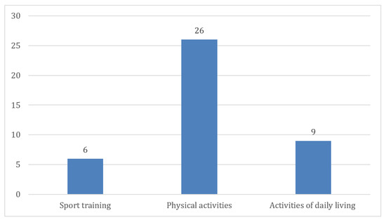 Differentiating between research focusing on sports training monitoring and that which emphasized physical activity observation, we uncovered three primary categories: sport training (six studies), physical activity (twenty-six studies), and activities of daily living (nine studies). Some studies bridged these categories by examining both activities of daily living and physical activities (Figure 7). One paper observed sleeping routine and stress levels while training, which was included in sport training [29], while another paper examined activity of workload [44], which was included in activities of daily living. Also, several papers examined ADL in addition with physical activities [28,30,34,39,43]. Within these studies, the objectives varied, with 7 studies concentrating on assessing the reliability and accuracy of devices, while the remaining 29 utilized smart technology as a means of data collection. Various studies have performed interventions in their research using or monitoring with wearable devices [14,16,17,23,26,37,42,45]. Two papers examined the correlation between physical activity or sport and the COVID-19 pandemic using wearables [26,46].