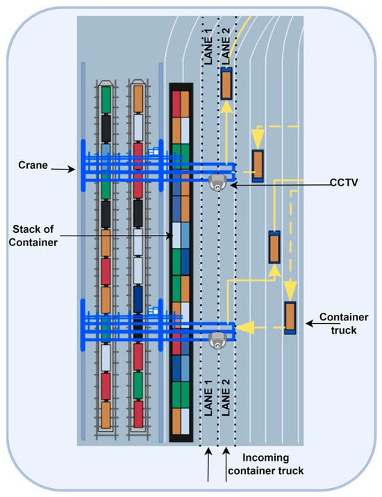 This investigation delves into the domain of container drayage operations at seaports, pivotal to global trade. Our research zeroes in on addressing the efficiency challenges of managing the parking facilities for drayage trucks. Furthermore, while recent efforts have aimed at collecting performance data for ports, the absence of standardized comparative data complicates performance evaluation. Various metrics have been explored, as indicated by the World Bank’s Container Port Performance Index (CPPI) [5], but consistent quality data remain elusive. Figure 1 depicts the operational layout of a seaport’s container terminal. The diagram portrays a seaport section with two clearly delineated lanes, marked by dashed lines, designated for the movement of container trucks. On the left, cranes hover above stacks of containers, showcasing the storage and handling mechanisms. In the central portion, container trucks of different colors can be seen, possibly indicating different categories or operational statuses. Additionally, strategically placed Closed-Circuit Television (CCTV) cameras suggest a focus on security and operational monitoring within the terminal.