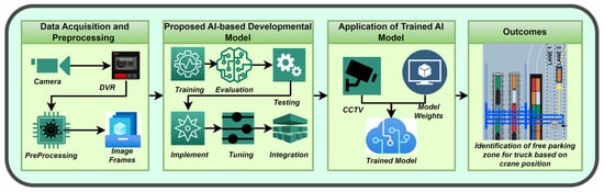 In our rapidly urbanizing world, urban centers face an array of opportunities and challenges encompassing sectors such as housing, transportation, education, healthcare, and the economy [1]. As we navigate these intricate issues, the integration of artificial intelligence (AI) and computer vision (CV) emerges as a potent tool for crafting smarter urban ecosystems. Among various sectors, one area that has gained prominence is the role of intelligent mobility in the evolution of smart cities [2,3,4]. Within this context, container transportation at seaports has become a linchpin, especially concerning the efficient management of parking facilities for drayage trucks, which are crucial for transporting containers between ships and their designated areas.