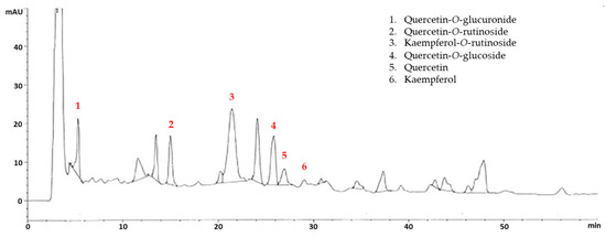 Based on the findings from the analysis using high-performance liquid chromatography/electrospray ionization mass spectrometry (HPLC/ESI-MS), as depicted in Figure 1 and Table 1, MPE comprised identifiable constituents such as quercetin-O-glucuronide, quercetin-O-rutinoside, kaempferol-O-rutinoside, quercetin-O-glucoside, quercetin, and kaempferol. These findings indicate that the MPE contained quercetin, kaempferol, and their respective derivatives.