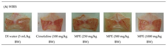 Water immersion and restraint stress (WIRS) led to gastric ulcers in rats. Apparently, a reference dosage of NSAID cimetidine (100 mg/kg BW) potently diminished the length of the gastric ulcer, while MPE (250, 500, and 1000 mg/kg BW) also did so independently of the dose, indicating inhibitory values of the gastric ulceration at 92.5, 10.9, 20.0, and 19.7%, respectively, when compared with the DI water treatment (Table 6 and Figure 2A).