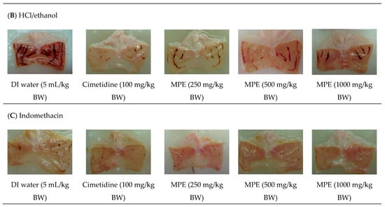 The stomach mucosal barrier of rats was damaged by the administration of HCl and ethanol, resulting in inflammation and gastric ulcers. HCl/ethanol-induced gastric ulcers in rats were investigated following the method of Mizui and Doteuchi [27]. Thirty male rats, weighing 180–200 g, were randomly divided into five groups (n = 6 each). Rats were fasted for 48 h before receiving the treatment but had free access to water except for 1 h before initiation of the experiment. DI water (5 mL/kg BW), cimetidine (100 mg/kg BW), and MPE (250, 500, and 1000 mg/kg BW) were orally given to the rats in each group 1 h before induction of the gastric ulcers. The rats were then orally fed with HCl in ethanol (36.5% v/v, 5 mL/kg BW). After 1 h, the rats were anesthetized by intraperitoneal injection of pentobarbital sodium (40 mg/kg BW), and their stomachs were dissected and rinsed with normal saline. The stomachs were then opened and photographed. The total lengths of the gastric lesions were determined under light microscopy. Gastroprotective effects were expressed as the percentage of inhibition of the gastric ulcers when compared with the control.