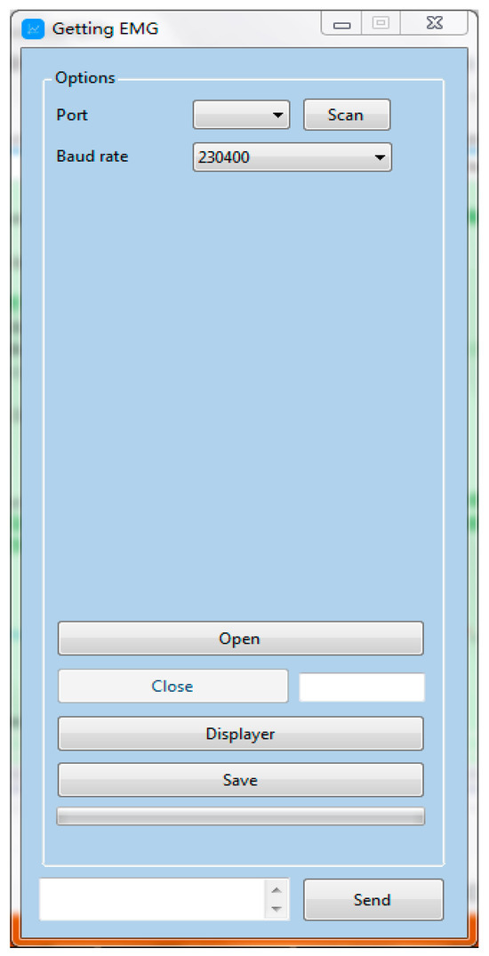Computer interface software programming is mainly used to implement the functions of reading EMG signals, saving EMG signals, and sending the required angle to the microcontroller. To facilitate the collection and storage of EMG signals, PC acquisition software is required. The PC acquisition software of this study was developed under the Visual Studio 2012 (VS2012) environment in the C# language.