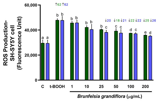 Effect of Brunfelsia grandiflora extract on ROS generation produced by t-BOOH on SH-SY5Y cells after 22 h coincubation (green bars) and preincubation (blue bars). ROS generation data were measured as fluorescence units (mean ± SEM) of 6 replicates. Different letters (a, b, c, d, e) show significance (p < 0.05) between groups. ↑ represents increase (%) compared with control; ↓ represents decrease (%) compared with t-BOOH. Statistical comparison was made between the groups including pretreatment or between those including cotreatment, never between pretreatment and cotreatment groups.