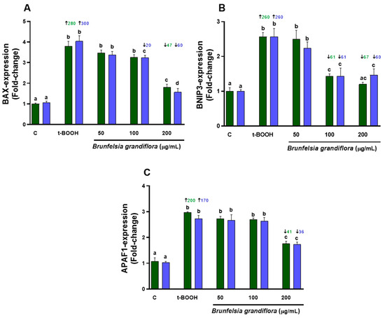Effects of B. grandiflora extract (50–200 µM) on cell death-related mRNA levels (A) BAX, (B) BNIP3, and (C) APAF1 in SH-SY5Y cells after co- (green bars) and pretreatment (blue bars). mRNA levels were normalized with respect to control (mean ± SEM) of three replicates. Different letters (a, b, c, d) show significance (p < 0.05) between groups. ↑ represents increase (%) compared with control and ↓ represents decrease (%) compared with t-BOOH.