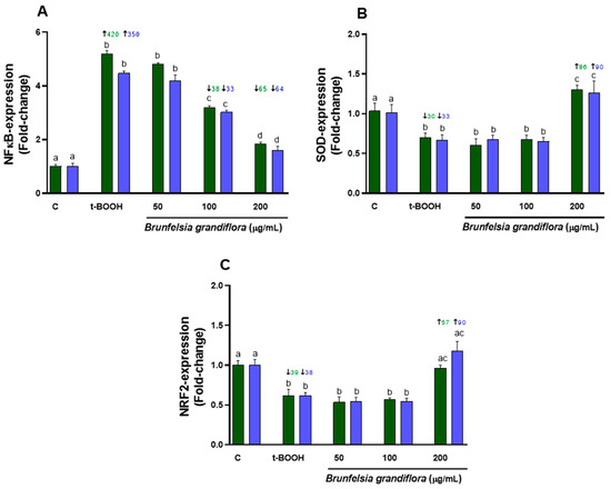Effects of B. grandiflora extract (50–200 µM) on the mRNA levels of oxidative stress-related genes (A) NFκB, (B) SOD, and (C) NRF2 in SH-SY5Y cells after co- (green bars) and pretreatment (blue bars). mRNA expression was normalized with respect to control (mean ± SEM) of three replicates. Different letters (a, b, c, d) show significance (p < 0.05) between groups. ↑ represents increase (%) and ↓ represents decrease (%) compared with control and compared with t-BOOH, respectively.