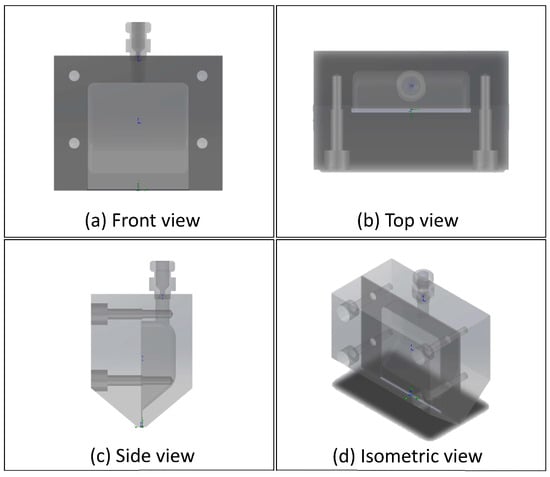Nozzle geometry: (a) front view, (b) top view, (c) side view, (d) isometric view.