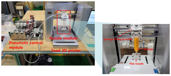 For stable discharge of ODF results, a dedicated nozzle was designed and selected, and a food 3D printer and pneumatic pressure syringe-type dispensing system was manufactured as follows.