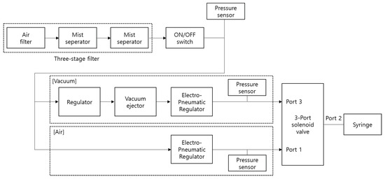 The overall operating sequence of the pneumatic control module is shown in Figure 3. Initially, the air passes through a three-stage filtration system consisting of an air filter, dust filter 1, and dust filter 2. The air filter removes impurities from the air drawn into the pressure generation unit, while dust filter 1 and dust filter 2 control the particle size of airborne dust particles to µm and µm, respectively. The filtered air is then drawn in through the pressure relief 3-port valve, and the pressure within the system is regulated to fall within the range of 0.3∼0.5 MPa using a pressure sensor. The supplied air is utilized for vacuum generation and supply pressure control. The vacuum generation process is as follows. To provide consistent pressure from irregular air pressure, the pressure of the pneumatic regulator (ARM10 series, SMC) is manually set to 0.35 MPa, and the pressure generator, i.e., the ejector (ZK2 series, SMC), creates a vacuum state. The electro-pneumatic regulator (EPR) adjusts the pressure for the vacuum within the range of −100∼0 KPa, generating precise vacuum pressure. A pressure sensor senses the accuracy of the vacuum pressure, and it is then connected to the 3-port solenoid valve 3 to switch the vacuum state for use. The supply pressure control process is separate from the vacuum generation process. The supplied air pressure is regulated within the range of 0∼0.9 MPa using the EPR device. A pressure sensor senses the numerical value of the pressure, and it is connected to the 3-port solenoid valve 1, increasing the internal air pressure. Finally, the 3-port solenoid valve 2 is connected to the syringe. The operating principle of the 3-port solenoid valve is as follows. When the control switch attached to the syringe dispensing system is activated, it increases the internal air pressure within the syringe through the path from 1 to 2, causing the ejection of the liquid contained in the syringe. When the control switch is not activated, the supplied air is blocked, and the air is exhausted from 2 to 3. At this time, the internal state of the syringe becomes a vacuum, causing the cessation of liquid discharge.
