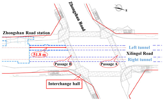 The Zhongshan Road Station-to-Xinhua Square Station section of Urban Rail Transit Line 2 in Hohhot was constructed using shield tunneling. The shield tunnel has an approximate burial depth of 12.1 m, an outer diameter of 6.2 m, a shield segment thickness of 0.35 m, and a tunnel spacing of 9.8 m. The shield tunnel crosses beneath the Xilinnan Road and Zhongshan Road intersection at a 65-degree angle, interacting with the underground pedestrian passages project. The distance from the shield tunnel’s arch to the bottom plate of the underground pedestrian passages is approximately 2.5 m. The layout of the underground pedestrian passages is in the form of “intersecting parallels”, with a width of 6.9 m, a height of 4.2 m, and a burial depth of 5.4 m, forming a single-story box-like structure underground. The interchange hall is constructed using the cut-and-cover method, while the passage utilizes the rectangular pipe-jacking method. Each pipe segment has a length of 1.5 m. In total, there are 32 pipe segments in Passage A, spanning a length of 48 m, and 28 pipe segments in Passage B, covering a total length of 42 m. The spacing between Passage A and B is 50 m. The engineering plan is depicted in Figure 1.