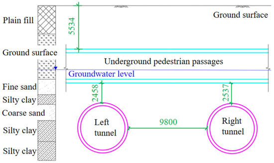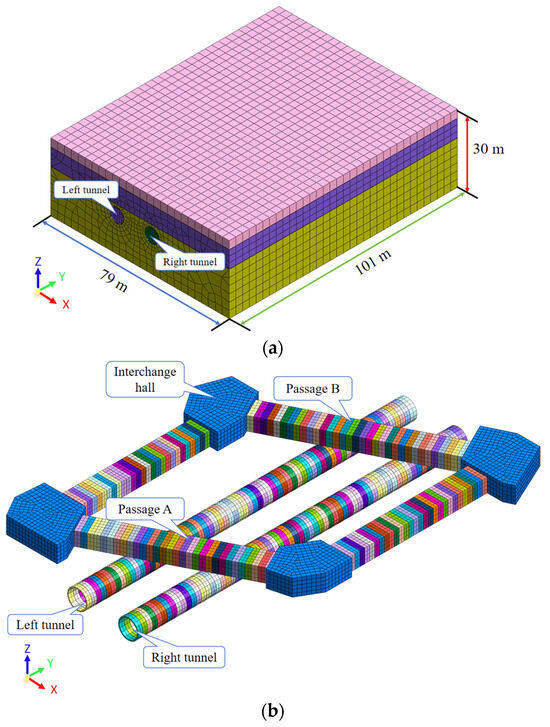 A three-dimensional numerical model was constructed using the 3D finite element software Midas GTS NX (2020). The nonlinearity of materials and the initial stress state of soils could be considered in the software, which could further reflect the actual site condition. Under the different loads and boundary conditions, static, dynamic, consolidation and construction phase analysis can be carried out. Midas GTS NX works using a multi-frontal solver. The solver has the advantage of reducing the number of calculations and memory requirements. In addition, computational efficiency may be improved. It can provide more dependable results for complex engineering analysis and design. The model’s dimensions are as follows: along the x-axis, it spans 79 m; along the y-axis, it covers 101 m; and along the z-axis, it extends 30 m. The spatial layout of the tunneling section, which includes the shield tunnel and the underground pedestrian passages (comprising 4 pedestrian passages and 4 interchange halls), faithfully replicates the actual project layout, as illustrated in Figure 5. The model consists of 199,429 mesh elements and 106,404 nodes. In the simulation, the outer diameter of the shield tunnel lining is 6.2 m, with a width of 1.5 m and a thickness of 0.45 m. The thickness of the underground pedestrian passages is also 0.45 m.