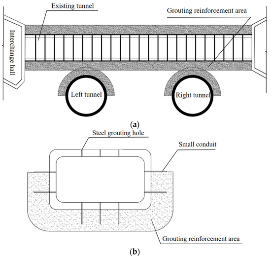 Illustrations of different reinforcement approaches. (a) Grouting reinforcement; (b) steel support reinforcement.