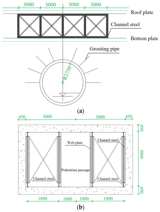To reinforce the tunnel, an interior steel support framework was installed within the existing tunnel structure. This reinforcement spanned the entire length of Passages A and B, through which the shield tunnel passed. The steel support framework utilized welded 25b channel steel, with diagonal bracing made from 10# channel steel. Support sets were placed at 3 m intervals, creating a robust steel framework structure. A 2-m pedestrian passage was maintained in the center to ensure the overall stability of the existing tunnel structure. The installation of the steel support framework is illustrated in Figure 4.