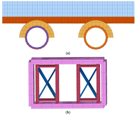 To avoid the occurrence of joint failure and groundwater seepage, lots of the measures can be adopted during the actual project to reduce the deformation of existing rectangular pipe-jacking tunnels. Based on some previous cases, interlayer soil grouting and steel support reinforcement are the most effective methods. A total of four schemes for numerical simulation were devised. Scheme 1 entails no reinforcement measures and is abbreviated as “No Reinforcement”. Scheme 2 involves interlayer soil grouting reinforcement, as illustrated in Figure 6a. Scheme 3 utilizes steel support reinforcement, depicted in Figure 6b. Scheme 4 combines both grouting and steel support reinforcement and is referred to as “Comprehensive Reinforcement”. The parameters of the shield machine should be adjusted appropriately. The chamber pressure and grouting pressure of the shield machine are the most important factors, as the parameters usually change during shield tunneling. In this paper, the parameters of the shield machine are not considered.