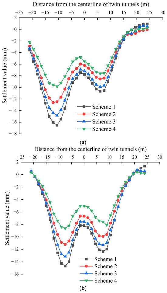 To facilitate a comprehensive comparison of settlement and deformation in both passages under different conditions, the maximum vertical displacements of the existing tunnels in different schemes are detailed in Table 3.