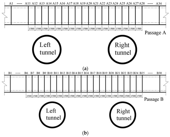 Monitoring point layout (unit: mm). (a) Passage A; (b) Passage B.
