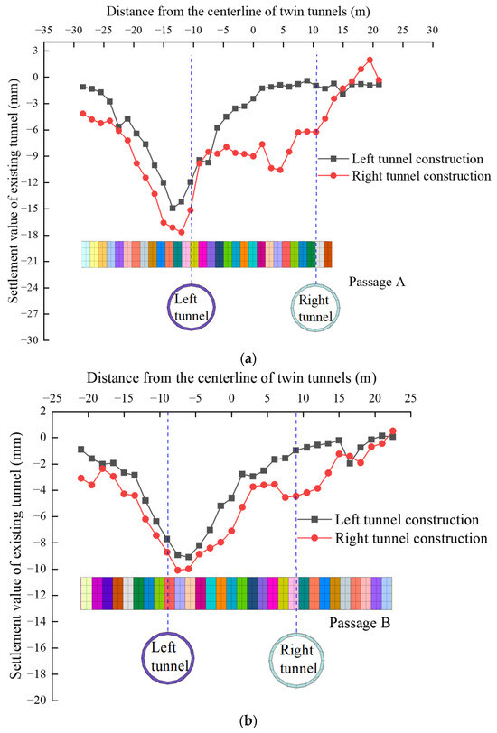 Settlement distribution of the existing tunnel. (a) Passage A; (b) Passage B.