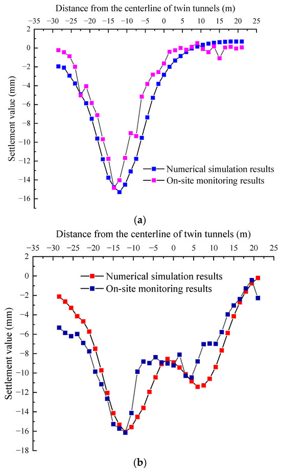 The maximum measured and simulated settlement in Figure 10a was 15.29 mm and 14.94 mm, respectively. The distribution exhibits a “V”-shaped curve, whereas after the completion of the right tunnel, the distribution exhibits a “W”-shaped curve. The maximum measured and simulated settlement in Figure 10b is 17.67 mm and 16.06 mm, respectively. In summary, the simulated results align reasonably well with the actual monitoring data, supporting the validity of the numerical simulation and preparing for subsequent safety control measures.