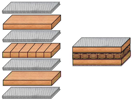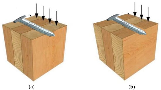 It is essential to reinforce the wood, notably at vulnerable connection points []. In addition, the low density of certain wood species, such as poplar, may results in undesirable mechanical properties. There are various techniques to reinforce EWPs and improve the mechanical strength of timber structures, including but not limited to reinforcement using metals or fiber-reinforced polymers (FRPs). According to Saribiyik and Akguuml [], reinforcing the connections aims to preserve the continuity of structures and lessen the drawbacks of connection elements with nails and bolts. Several investigations on concrete [,], metal plates [,,,], rods, and bars as reinforcement in wood-based products have been performed.