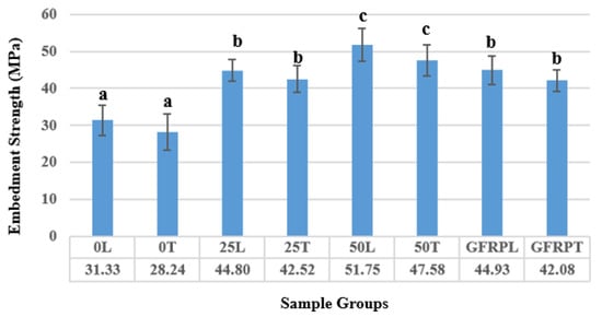 Comparing the embedment strength of CLT samples manufactured from densified wood and those reinforced with GFRP was one of the goals of this investigation. The embedment strength of the GFRP-reinforced CLT samples was compared with that of CLT samples constructed out of densified wood, and the average embedment strength of the CLT specimens is illustrated in Figure 4. The highest embedment strength belonged to the 50L samples (51.75 MPa), while the lowest embedment strength belonged to the 0T samples (28.24 MPa). The embedment strength of the CLT samples in the L direction was greater than in the T direction. More specifically, the embedment strength of 0L, 25L, 50L, and GFRPL samples was 10.9%, 5.4%, 8.8%, and 6.8% more, respectively, than that of their counterpart samples tested in transverse direction. Reinforcement with 25% densification, 50% densification, and GFRP improved the embedment strength by 43%, 65.2%, and 43.4%, respectively, compared to the unreinforced samples in the L direction (0L). On the other hand, reinforcement with 25% densification, 50% densification, and GFRP improved the embedment strength by 50.6%, 68.5%, and 49%, respectively, compared to the unreinforced samples in the T direction (0T). In addition, no significant difference was observed in the embedment strength of reinforced CLT samples with 25% densification and GFRP in both directions (L and T). Therefore, it can be concluded that CLT with the same embedment strength can be produced using wood with a densification ratio of 25% rather than reinforcing it with GFRP. This alternate method demonstrates more efficiency in terms of both its cost and implementation. Previously, it was reported that embedment strength perpendicular to the grain was lower than that parallel to the grain [,,,]. Reinforcement with densification enhanced the wood density resulting in higher embedment strength of CLT samples. From a designer’s point of view, wood density and dowel diameter are the main properties of design. There are also some approaches where density is the only parameter [,]. Concerning face side insertion in CLT, Uibel and Blab [,] evaluated the load-bearing capacity of dowels placed in manufactured with four distinct arrangements and computed the embedment strength. The CLT embedment strength prediction model was suggested based on the variable CLT lamination characteristics.