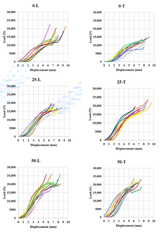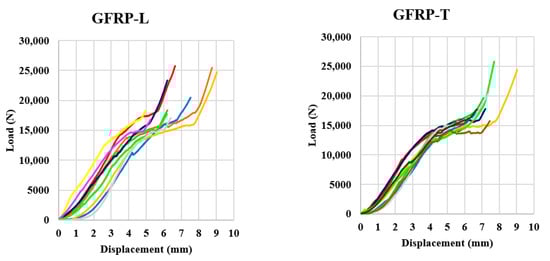 The load displacement of control, densified, and GFRP-reinforced CLT specimens is shown are Figure 5. Accordingly, the yield points of the CLT samples in the L direction were more than those in T direction. The yield points of 0L, 25L, 50L, and GFRPL were 8636 (N), 11,900 (N), 16,080 (N), and 13,720 (N), respectively. The highest yield point in the L direction belonged to the CLT sample reinforced with 50% densified wood. On the other hand, the yield points of 0T, 25T, 50T, and GFRPT were 7947 (N), 11,450 (N), 13,152 (N), and 12,120 (N), respectively. The highest yield point in the L direction belonged to the CLT sample reinforced with 50% densified wood.