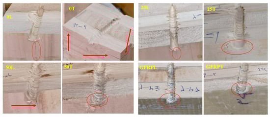 The failure modes of CLT specimens are depicted in Figure 6. The typical failure modes of tested CLT specimens are different in the situation where the lag screw is loaded in the L and T direction of the CLT specimens. Cracks occurred along the grain when the load was applied along with the L direction, as shown in Figure 6 (0L, 25L, and 50L). Cracks in 25L and 50L show that the densification reduced the length of the cracks compared to the unreinforced samples (0L). However, compression failure occurred in the embedment surface, as shown in Figure 6 (0T, 25T, 50T, GFRPL, and GFRPT), or cracks appeared on both edges of the cross layers, as shown in Figure 6 (0T), when the CLTs were loaded in the T direction. The compression failure might occur layer by layer, which results in stress redistribution [].