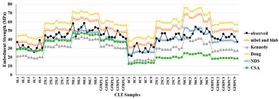 The Kennedy [], NDS [], Ubel and Blub [], Dong [], and CSA [] equations were used in this study to predict the embedment strength of CLT. These equations were developed based on various factors, such as density, loading direction, and so on.