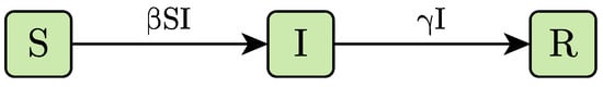 The SIR model is a compartmental model used in the field of epidemiology that describes the transmission process of an infectious disease through a system of differential equations. As we can see in Figure 1, the total population is divided into three mutually exclusive compartments, namely Susceptible (S), Infected (I), and Recovered (R) [13]. Individuals move from one compartment to another as time passes based on different transfer rates.