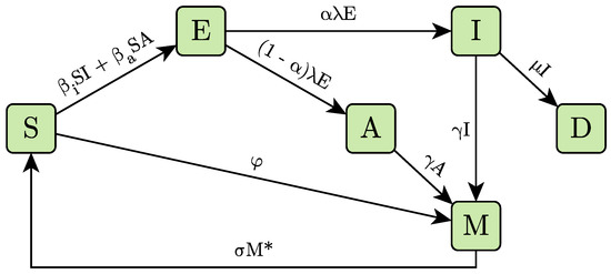 Taking into account the inputs and outputs of each compartment that is part of the SEIAMD model (see Figure 2), we can follow step by step the construction of the equations that we have just presented.