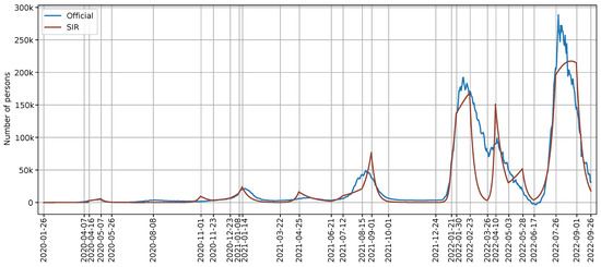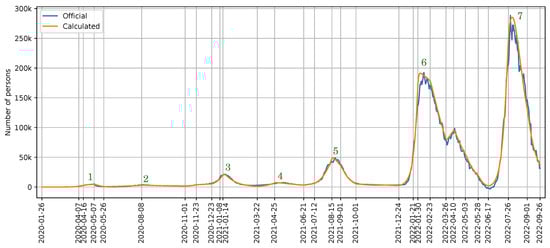 To showcase the feasibility of the proposed SEIAMD model to the COVID-19 pandemic in Tokyo, we used the implementation discussed in Section 2.2. The closer the calculated data are to the official number of persons infected, the more suitable our SEIAMD model is for the purpose discussed in this paper. The nearness between the official and calculated data is shown in Figure 3. This figure shows the number of persons identified (y-axis) for each day (x-axis). The values of the plotted curve of the official data are obtained directly from the official data provided by health authorities [26]. The values of the plotted curve of the calculated data are obtained by executing the last function described in Section 2.2. As we can see, both curves are highly overlapped for most days.