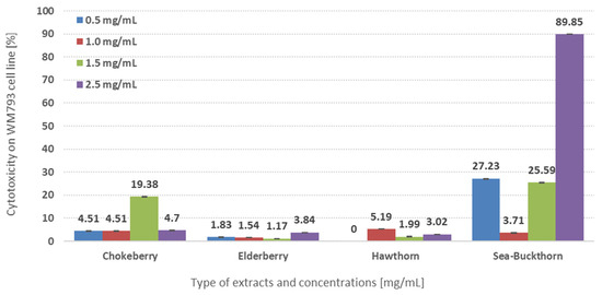 When analyzing the effect of different extracts obtained from cookies with the addition of selected wild-grown fruits on their anticancer properties against human skin cancer (melanoma) WM793 cells, statistically significant differences were observed between the mean values of cytotoxicity and viability (p < 0.05) (Table 2). Cookies’ extracts containing sea buckthorn berries were the most effective in defending WM793 melanoma cells at three concentrations added (0.5 mg/mL; 1.5 mg/mL, and 2.5 mg/mL) (p < 0.05) (Figure 1). This results in 89.95% cytotoxicity and the lowest viability (45.93%) at the highest concentration applied (2.5 mg/mL) (Table 2, Figure 1). The inhibiting potential of cancer cell growth upon lower concentrations of sea-buckthorn extracts was 0.5 mg/mL—27% cytotoxicity and 76% viability; 1.5 mg/mL—26% cytotoxic force and 70% viability (Table 2). The remaining extracts containing other berries were definitely less efficient (p < 0.05) than the fruits of Hippophae rhamnoides L. depending on the dose used (Figure 1). Elderberry showed the greatest cytotoxicity (3.84%) potential at the highest concentration (2.5 mg/mL) while cookies baked with the addition of hawthorn fruits showed the highest activity at a concentration of 1 mg/mL—5.19% and with the addition of chokeberry fruit at 1.5 mg/mL—1.99% (Table 2).