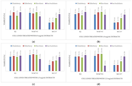 The comparison of different extracts containing wild grown fruits on human normal fibroblasts BJ, melanoma WM793 and breast tumor MCF7 cell lines depending on the extract concentration: (a) 0.5 mg/mL; (b) 1 mg/mL; (c) 1.5 mg/mL; (d) 2.5 mg/mL. The different letters by the number value of the graph bars are significantly different at p < 0.05.