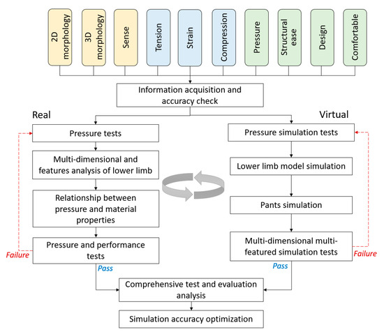 By means of experimental testing and numerical simulation, many researchers have studied the consistency between the real and virtual pressure values of compression pants, which provides a valuable reference for improving and optimizing the virtual simulation design process. Zhang et al. [12] analyzed the relationship between contact pressure and strain and its changing trend by using the finite element method and established an equation to evaluate the pressure of simulated socks. Jariyapunya and Musilová [13] discovered that the predicted pressure was close to the pressure measured using the compression tester on a rigid body, while the soft tissue surface had no effect on the pressure disturbance, and the measured pressure was close to the predicted pressure value obtained via modeling. Dan and Shi [14] adopted the finite element method to simulate the dynamic relationship between waist pressure and the displacement of elastic tights. Zhang [15] compared and analyzed experimental pressure data with clothing comfort pressure data and verified the simulation, optimization, and correction of clothing structure rationality, which can effectively improve the accuracy of clothing structure simulation design. Hu et al. [16] used CLO 7.0 software to carry out virtual fitting, extract the feature points, and establish a virtual pressure comfort evaluation model. Brubacher et al. [17] used Optitex to simulate the pressure distribution of compressed garments and confirmed the effectiveness of virtual simulation in evaluating the performance of compressed garments. Lee et al. [18] examined stress and strain through 3D virtual fitting to assess the users’ satisfaction with the movement of body parts and posture, wearing comfort, and compression, while wearing tight pants. These studies emphasize the importance and reliability of virtual simulation in predicting the pressure value of compressed clothing design, provide guidance for improving and optimizing the virtual design process of compressed clothing, and contribute to the progress of virtual simulation technology and its integration with the compressed clothing design workflow.