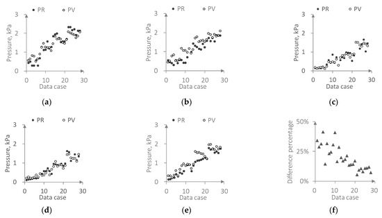 Comparison of PV and PR data of five materials: (a–e) pressure of M1, M2, M3, M4, and M5; (f) average difference.