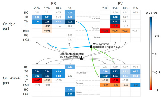For easy observation, only the average correlation coefficients with a high significance value (p value < 0.05), such as the thickness characteristic TM, are shown in the table. As can be seen in Figure 4, in the rigid part, the KES test data for the T0 and TM variables had a significant positive correlation with PR of 5…20%, whereas in the flexible part, the thickness properties of the RC, T0, and TM variables of the materials have significant positive correlations with PV of 5…20% of the PV. Moreover, the elastic properties of the LT and EMT variables have significant negative correlations with pressure. Based on this relationship, the PV test values of flexible parts can be optimized.