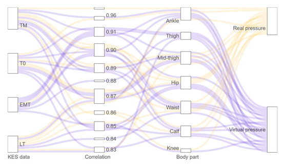 From the results in Figure 5, it can be seen that the correlation results between the PV and KES data are more significant. The correlation between the thickness characteristic of TM and PR and PV of several parts, such as ankles, waist, hips, and legs, was strong, with correlation coefficients ranging from 0.85 to 0.96. In addition, the correlation between the elastic properties of EMT and PR and PV of several parts, such as the thighs, hips, ankles, and waist, was strong, with correlation coefficients ranging from 0.85 to 0.91. The thickness and elastic properties of the materials are significantly correlated with the pressure values of multiple body parts, and the tensile and thickness properties of materials in the virtual system also have a greater influence on the pressure values. The strong correlation between the PV and KES data can be used to analyze the pressure value of the flexible parts.