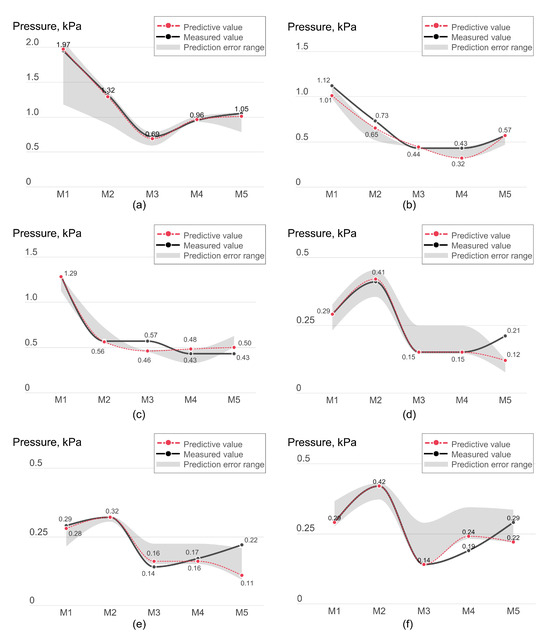 The PR measurement and prediction values based on the mechanical properties of the material: (a) PRhip (E = 15%) calculated based on variable LT; (b) PRhip (E = 10%) calculated based on variable T0; (c) PRwaist (E = 10%) calculated based on variable T0; (d) PRthigh (E = 5%) calculated based on variable HG5; (e) PRmid-thigh (E = 5%) calculated based on variable HG5; (f) PRcalf (E = 5%) calculated based on variable G.