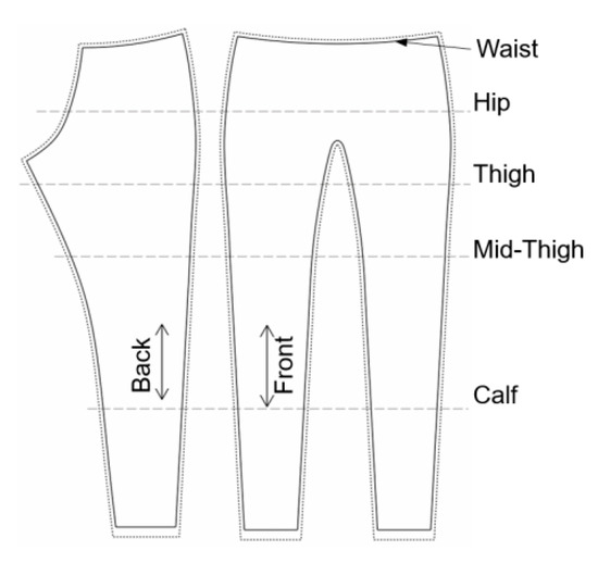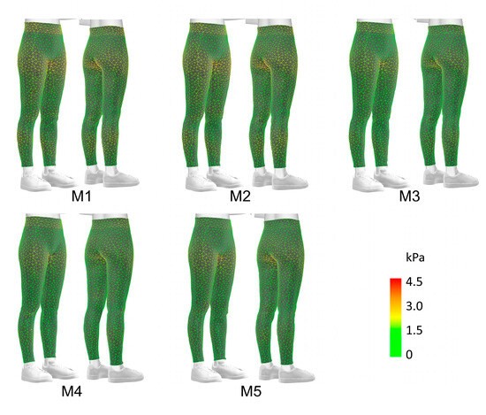 Many studies have concluded that the performance of the material is the pivotal factor influencing the comfort felt while wearing compression pants [1,2,3]. However, it is worth noting that well-designed and balanced pressure distribution can greatly enhance both the comfort and aesthetic appeal of these pants [4]. The absence of realistic pressure distribution can result in the compression pants feeling unnatural, restrictive, or uncomfortable when virtually worn, subsequently impacting the user’s satisfaction and acceptance. There is no fixed standard value for the pressure value of compression pants because the ideal pressure will vary depending on individual differences, the type of exercise, and the purpose. The design of compression pants should be adjusted according to the needs of the sport and personal preference; the pressure applied by different brands, materials, and specific designs of compression pants can vary and is usually measured in millimeters of mercury (mmHg) or kilopascals (kPa), with a common pressure range from 10 mmHg to 30 mmHg or higher [5]. However, it is important to note that a higher pressure does not always mean a better performance or recovery. If the product ignores the pressure value design of the compression pants, it may lead to the problem of unreasonable pressure distribution. An excessive pressure value can have negative effects on the human body, such as reduced blood circulation, muscle hypoxia, fatigue, and discomfort [6]. On the contrary, excessively low pressure values may cause harm and adverse effects during movement, will be unable to provide adequate support, may increase the instability and risk of injury during exercise, and fail to achieve the desired effect. Moderate pressure and reasonable pressure distribution can provide support and comfort [7], promote blood circulation and muscle recovery, while avoiding some adverse effects on human health and exercise performance. Therefore, for sports compression pants products, it is very important to maintain a suitable pressure value [8].