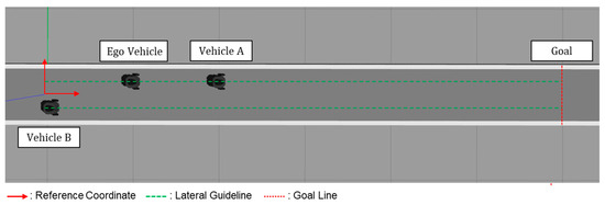 Figure 2. These nine parameters represent three pieces of information: goal-related, localization, and relationship states. A goal-related state is the information utilized to achieve a learning goal. The ego vehicle attempts to reach the goal line such that the goal-related state is the longitudinal relative distance