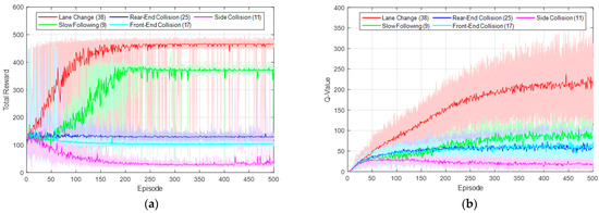 Figure 5a,b, the average of the 17 training results and each training result are depicted in cyan and shaded cyan, respectively. The total reward converged in the range of 100–110 after 100 episodes. The maximum Q-value increased slightly and was indistinguishable from the rear-end collision results.