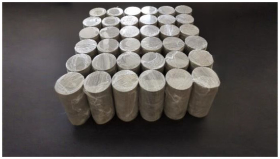 The rock samples used in this paper were taken from the South Open Pit Coal Mine of Tianchi Energy, Xinjiang, China. Concerning the test protocol [31], the rock samples were core drilled, cut, and prepared into standard cylindrical samples with a diameter of 50 × 100 mm (diameter height). After the sample preparation, the samples with obvious primary defects, fissures, and local defects were removed by observation, and the mudstone samples with similar longitudinal wave velocity were selected for testing. The processed samples are shown in Figure 1.