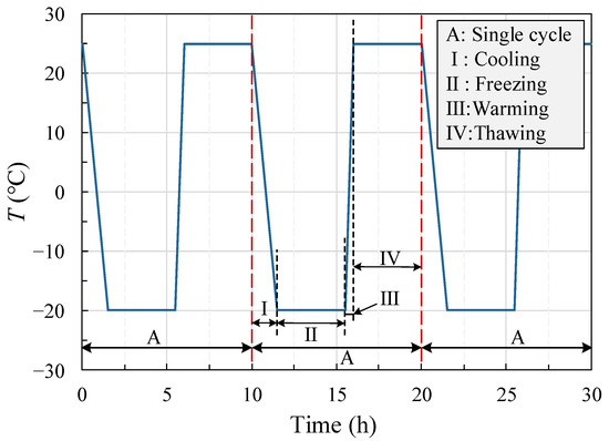 According to the “Rock Physical and Mechanical Properties Test Procedure” in the rock antifreeze test, the freezing and thawing time of mudstone tested in this paper was four hours, and the freeze–thaw cycle test process of the sample is shown in Figure 3. A single complete freeze–thaw cycle process is represented by A.