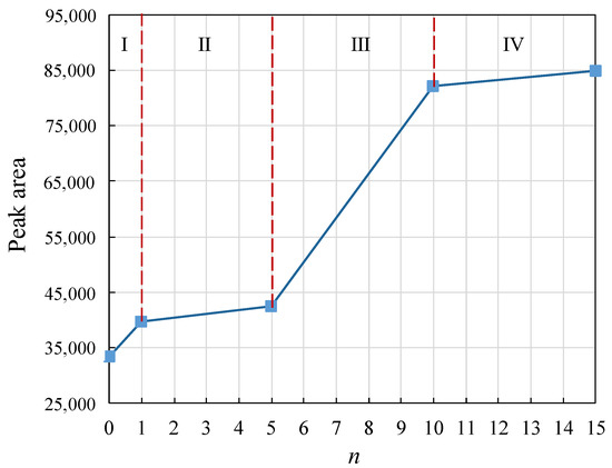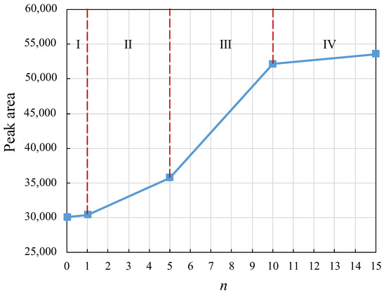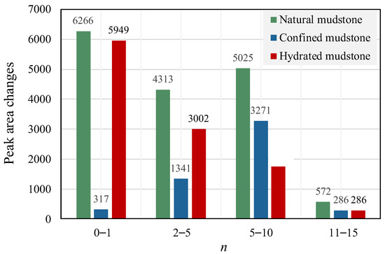 The peaks of the T2 spectra were counted for different test cycles to obtain Figure 8. The T2 spectral area of the natural mudstone samples increased with the number of freeze–thaw cycles. The average increase in each freeze–thaw cycle was different, and in general, the increase gradually decreased. According to the test program, the natural mudstone samples were divided into four stages with varying numbers of freeze–thaw cycles, namely, 0–1 freeze–thaw cycle (stage I), 2–5 freeze–thaw cycles (stage II), 6–10 freeze–thaw cycles (stage III), and 11–15 freeze–thaw cycles (stage IV), and the average increase in T2 spectral area of the natural mudstone samples with one freeze–thaw cycle in the four stages was 6266, 4313, 5025, and 525, respectively. For 4313, 5025, and 572, the increased value of porosity in the natural mudstone samples was the largest in the first freeze–thaw cycle; the overall trend gradually decreased; after ten freeze–thaw cycles, the increase in porosity decreased significantly, which was different from the change rule of the porosity of the confined mudstone only under the action of freeze–thaw damage.