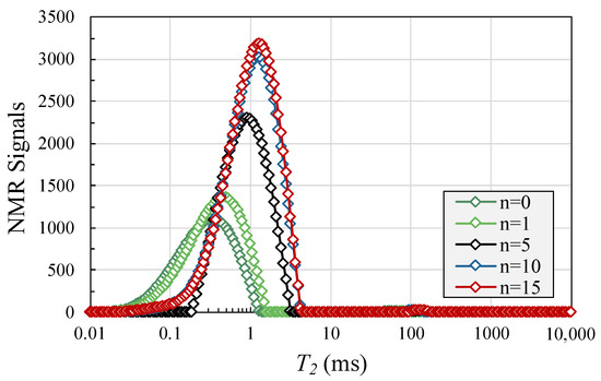 As seen from Figure 7, with the increase in the number of freeze–thaw cycles, the T2 patterns of the natural mudstone samples and the confined mudstone samples were similar in shape. They remained single-peaked, with the peak signals corresponding to a significant increase in the chirp time, from 0.345 ms (initial state) to 0.455 ms (1 freeze–thaw cycle), 0.912 ms (5 freeze–thaw cycles), 1.203 ms (10 freeze–thaw cycles), and 1.29 ms (15 freeze–thaw cycles). The peak signals and corresponding relaxation times were quadratically related to the number of freeze–thaw cycles. Under the same number of cycles, the peak NMR signal intensity increased significantly from 1112 (initial state) to 1367 (1 freeze–thaw cycle), 2305 (5 freeze–thaw cycles), 3030 (10 freeze–thaw cycles), and 3191 (15 freeze–thaw cycles), with an increase of 22.93%, 107.28%, 172.48%, and 186.96%, respectively. After freeze–thaw cycles of the natural mudstone samples, the intensity of the NMR signals increased significantly, the new pores became more numerous, and the average pore size increased.