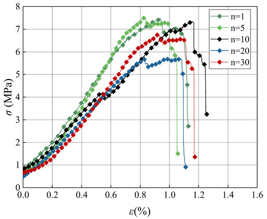To investigate the specific effects of moisture replenishment conditions on mudstone slopes in natural working conditions, uniaxial compression tests were conducted on natural mudstone samples after different freeze–thaw cycles, and the stress–strain curves are shown in Figure 10.