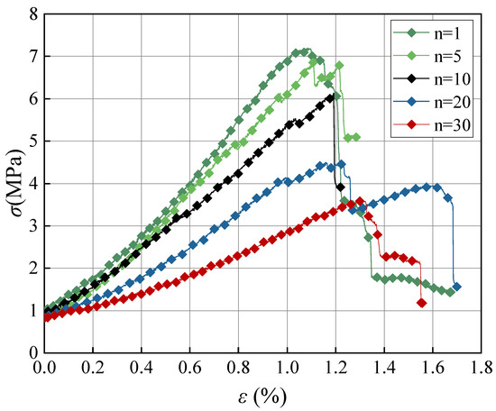 The natural mudstone samples suffered more freeze–thaw damage than the sealed mudstone samples. This is why the natural mudstone samples were rehydrated during the cycling process. The full stress–strain curves of mudstone under different numbers of freeze–thaw cycles were categorized into two types: the first type of curves showed the stress–strain characteristics of mudstone under lower numbers of freeze–thaw cycles (n = 1, 5, 10), and the second type of curves showed the stress–strain characteristics of mudstone under higher numbers of freeze–thaw cycles (n = 20, 30). Compared with the former, the second type of curve has a significant strain-softening phase after the peak and exhibits significant plastic deformation characteristics. In addition, the second type of curve also shows substantial differences in the nonlinear extension stage of cracks. In contrast, the first type of curve is mainly characterized by a slight decrease in the slope of the curves and gradually reaches the peak. In contrast, the second type of curve shows significant ups and downs in this stage, with multiple small peaks before the peak.